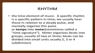 The basic unit of rhythm that divides time into equal segments is called the a. Rhythm is shaped by meter and has elements such as beat and tempo. Rhythm is the element of TIME in music.
